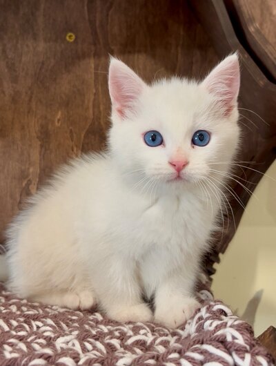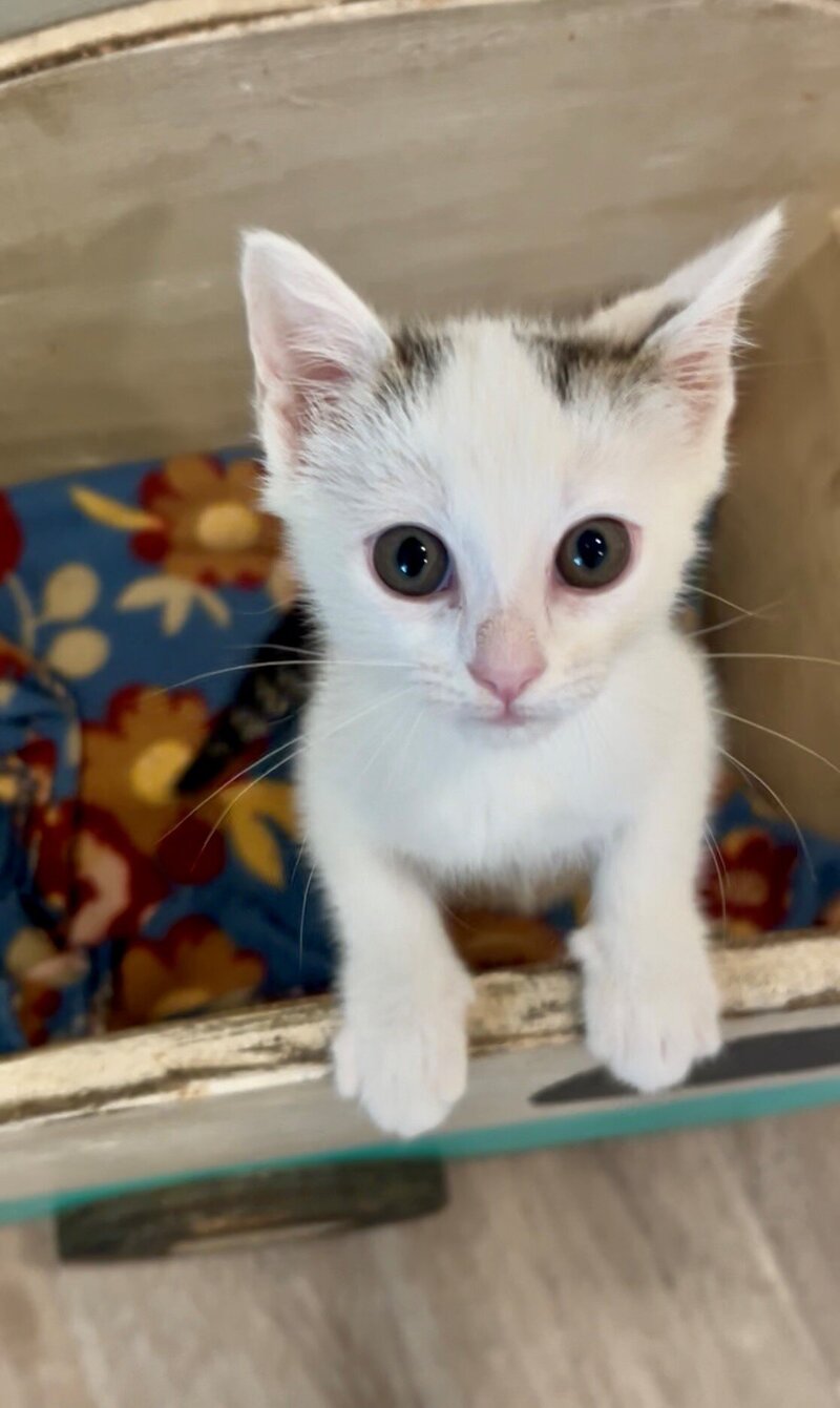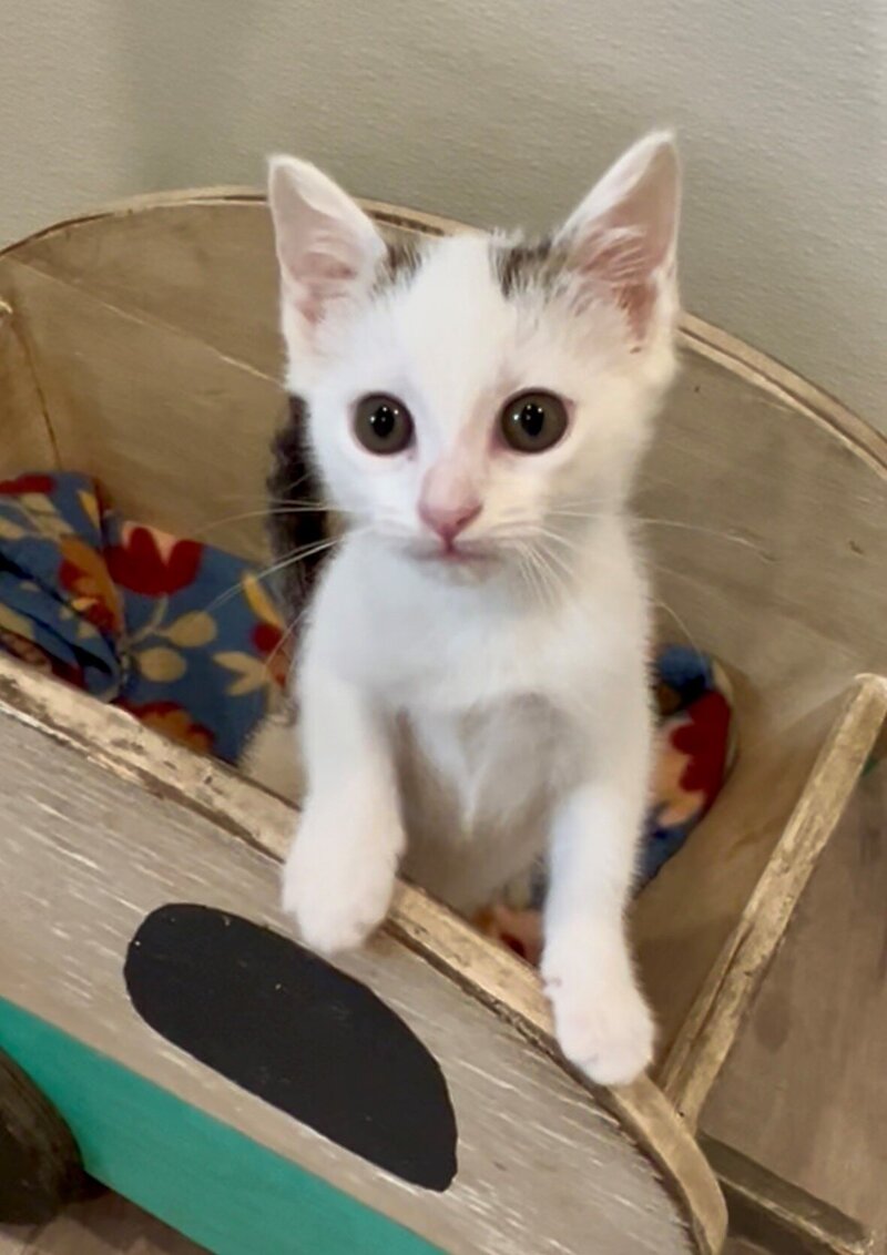 At just 4 months old, this bright-eyed kitten is bursting with curiosity and kitten energy. Whether he’s zooming around chasing wand toys like a tiny acrobat or batting at shadows with impressive focus, Kevin always brings the fun! Once he’s conquered playtime, you’ll find him curled up in your lap, purring his way into your heart.
