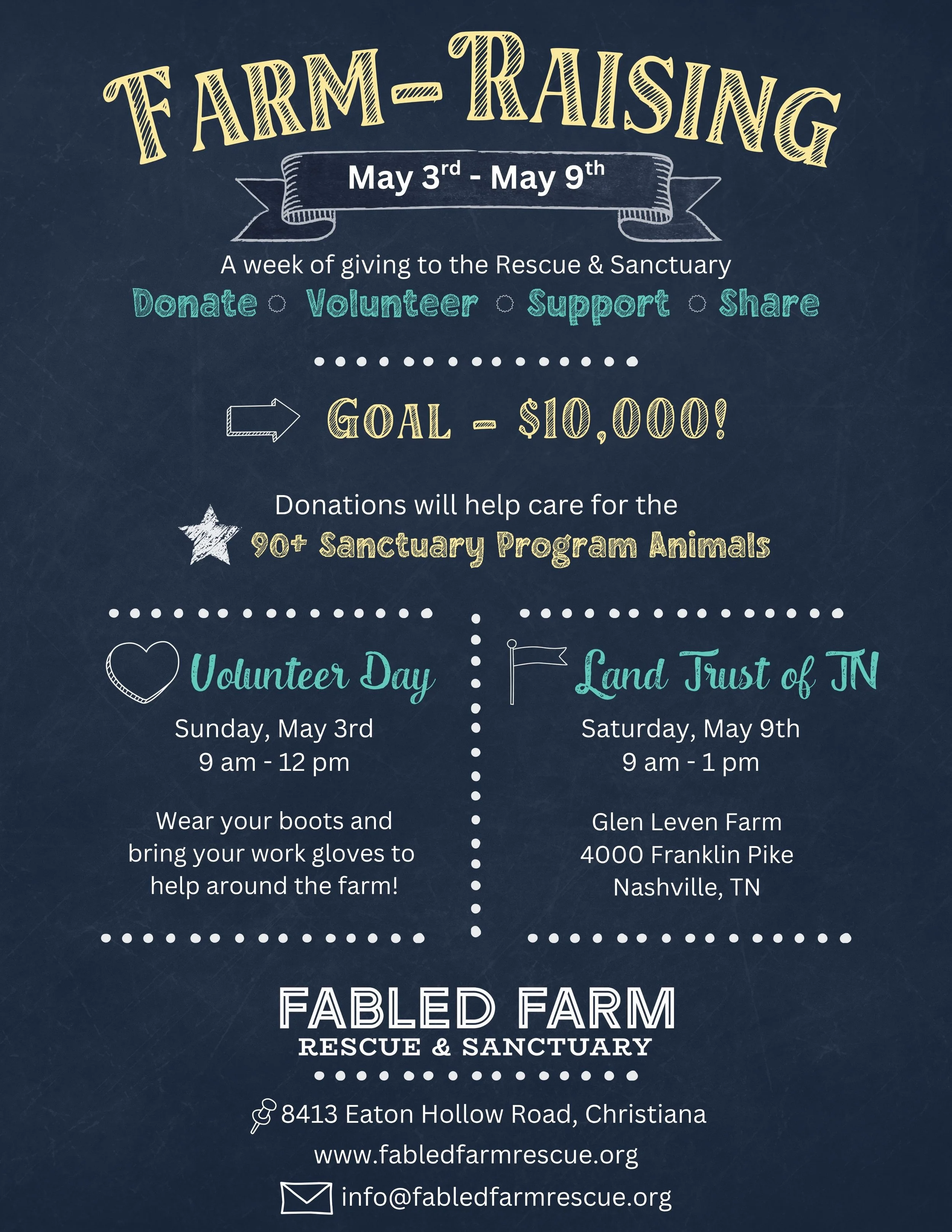 A week of giving for the animals who call Fabled Farm home From May 3–9, we’re coming together for our annual Farm-Raising with one goal in mind: $10,000 to support the Sanctuary Animals Right now, over 80 animals are living safely at Fabled Farm. Many are seniors. Many have special needs. And many are here because they needed a place that would say yes when others couldn’t. Your support provides: Daily care and specialized feed Veterinary care and medications Hoof care, dental work, and bodywork Comfort, enrichment, and the little things that make life joyful These animals are not “in between” homes. This is their home. Because of you, they get to live out their lives with dignity, comfort, and love. Together, we can make sure every single one of them continues to receive the care they deserve. Let’s make this our strongest Farm-Raising yet!